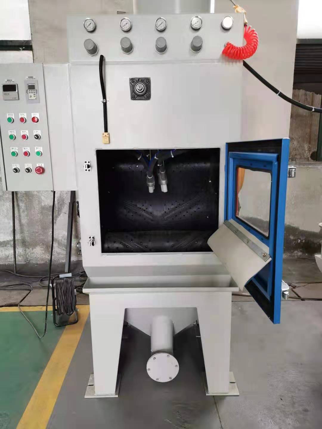 2、 操作時(shí)僅需工件定量置入環(huán)帶內(nèi),設(shè)定噴砂時(shí)間,即可啟動自動噴砂作業(yè),操作和維修均簡單易學(xué)。