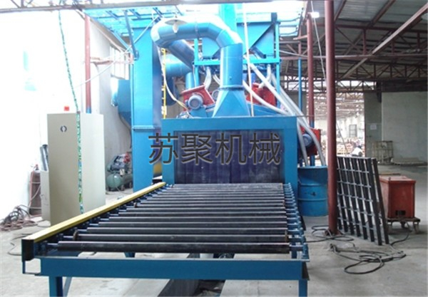 輥道式拋丸機是利用高效拋丸器拋出的高速彈丸流束擊打抽油桿表面上氧化皮、銹層及其雜物,使之獲得精細的光亮表面,使工件顯出金屬本色,有助于提高釬桿涂飾質量,達到防腐、護管、延長工件使用壽命之目的。